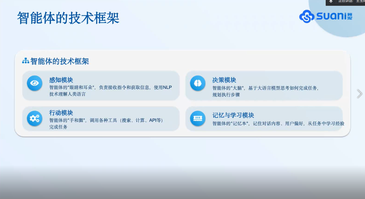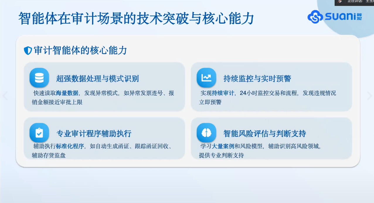 讲座特邀算泥社区MVP、AI大模型专家王玉烽担任主讲。在近两个小时的分享中,王玉烽以深入浅出的方式,系统梳理了智能体(Agent)的技术框架与核心能力,并重点结合财务分析、审计风控等具体业务场景,演示了如何利用Coze平台快速构建实用型智能体应用。