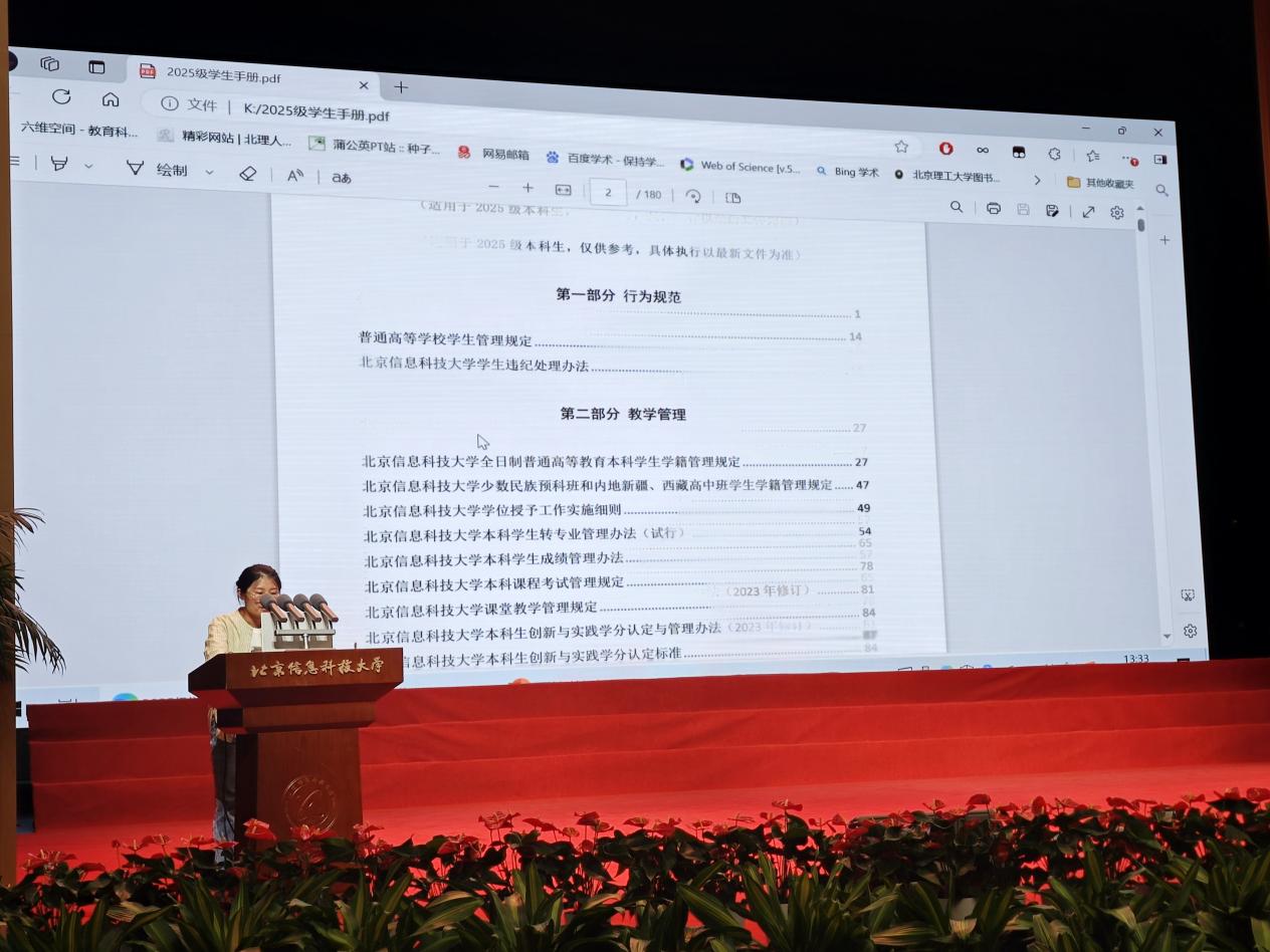王玉荣强调,《本科生手册》是学生在校期间学习、生活及行为规范的根本依据,其中详细列明了学籍管理、学位授予、课程考核与违纪处理等多项管理规定。学校在新生入学时已为每位同学发放纸质版手册,并组织了相关学习与考试。她呼吁同学们主动、深入学习手册内容,遇到疑问及时咨询相关老师,真正做到“心中有规、行为有度”。