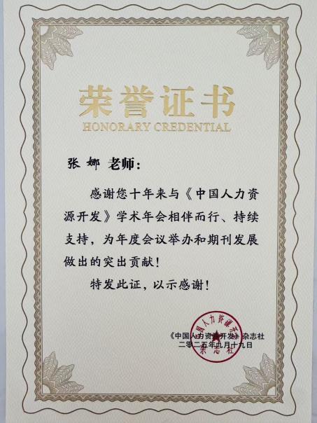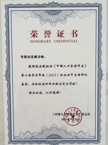 在9月19日的表彰及杂志发展研讨环节,澳门3044永利官网张娜教授荣获鼎力支持奖。自首届学术年会举办以来,张娜教授始终以研究者与实践者的双重身份参与其中,从早期的论文分享者到后来的分论坛主持人,她的身影贯穿了年会十年发展历程,持续为会议注入前沿研究视角与实战经验,用长期坚守诠释了对中国人力资源管理学术领域的深切热爱与坚定支持。
